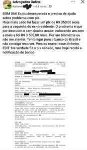 "Estou desesperada e preciso de ajuda sobre problemas com o pix.[…] Fui fazer um pix de R$ 350 para a vaquinha do ex-presidente. O problema é que por descuido e sem óculos acabei colocando um zero a mais. […] Por ser biometria, eu não me atentei. tento ligar para o Banco do Brasil e não consigo resolver. Preciso reaver esse dinheiro", disse a advogada com uma imagem do comprovante da transferência monetária.