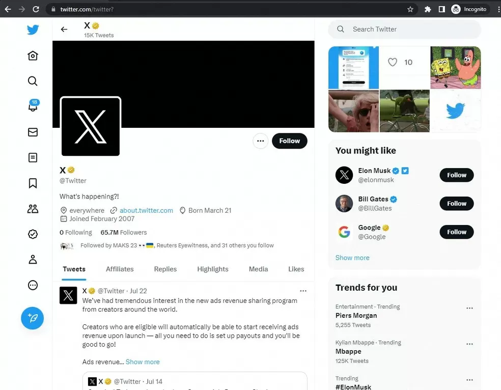 Os perfis de Musk e da CEO da rede social, Linda Yaccarino, agora apresentam o logotipo X, embora o pássaro azul do Twitter ainda esteja visível em toda a plataforma.