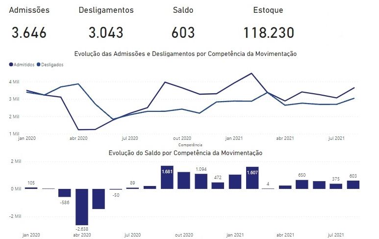 Em 2021, o comportamento das admissões por mês é: janeiro, 3.923; fevereiro, 4.483; março, 3.380; abril, 2.888; maio, 3.411; junho, 3.255 e julho, 3.068. Já os desligamentos foram: janeiro, 2.884; fevereiro, 2.876; março, 3.376; abril, 2.644; maio, 2.761; junho, 2.691 e julho, 2.693.