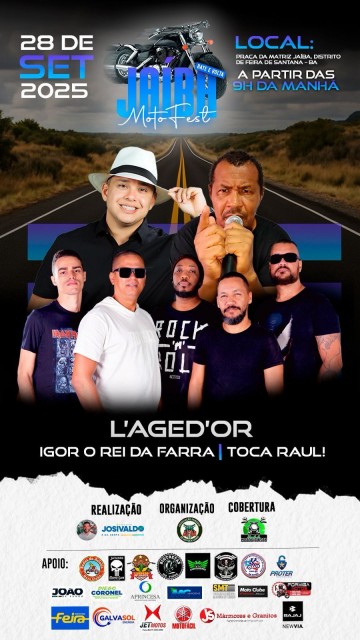 1º Jaíba MotoFest, que será realizado no próximo domingo, 28 de setembro, a partir das 9h, na Praça da Matriz, distrito de Jaíba, em Feira de Santana.