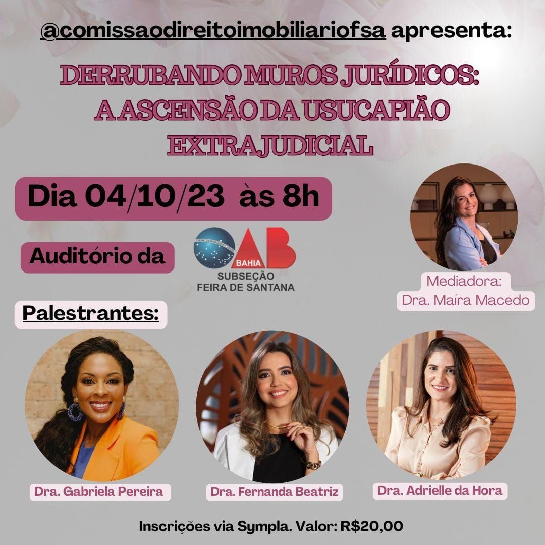 Comandando o debate estará a renomada advogada imobiliarista soteropolitana, Dra. Gabriela Pereira, reconhecida pelo seu perfil no Instagram @seujuridicoimobiliario. Junto a ela, teremos a presença das advogadas feirenses Dra. Fernanda Beatriz e Dra. Adrielle da Hora. A mediação ficará por conta da advogada Dra. Maíra Macedo, que preside a comissão organizadora do evento.