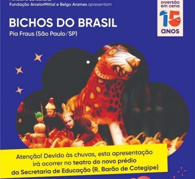 No próximo sábado, 25 de outubro, às 16h, Feira de Santana recebe o espetáculo "Bichos do Brasil", no teatro da Secretaria Municipal de Educação (Rua Barão de Cotegipe, s/n, ao lado do Centro Integrado de Educação Inclusiva Colbert Martins da Silva/antigo Feira Tênis Clube). A apresentação gratuita, idealizada pela companhia teatral Pia Fraus, de São Paulo (SP), faz parte do programa Diversão em Cena, iniciativa patrocinada pela Fundação ArcelorMittal e pela Belgo Arames.