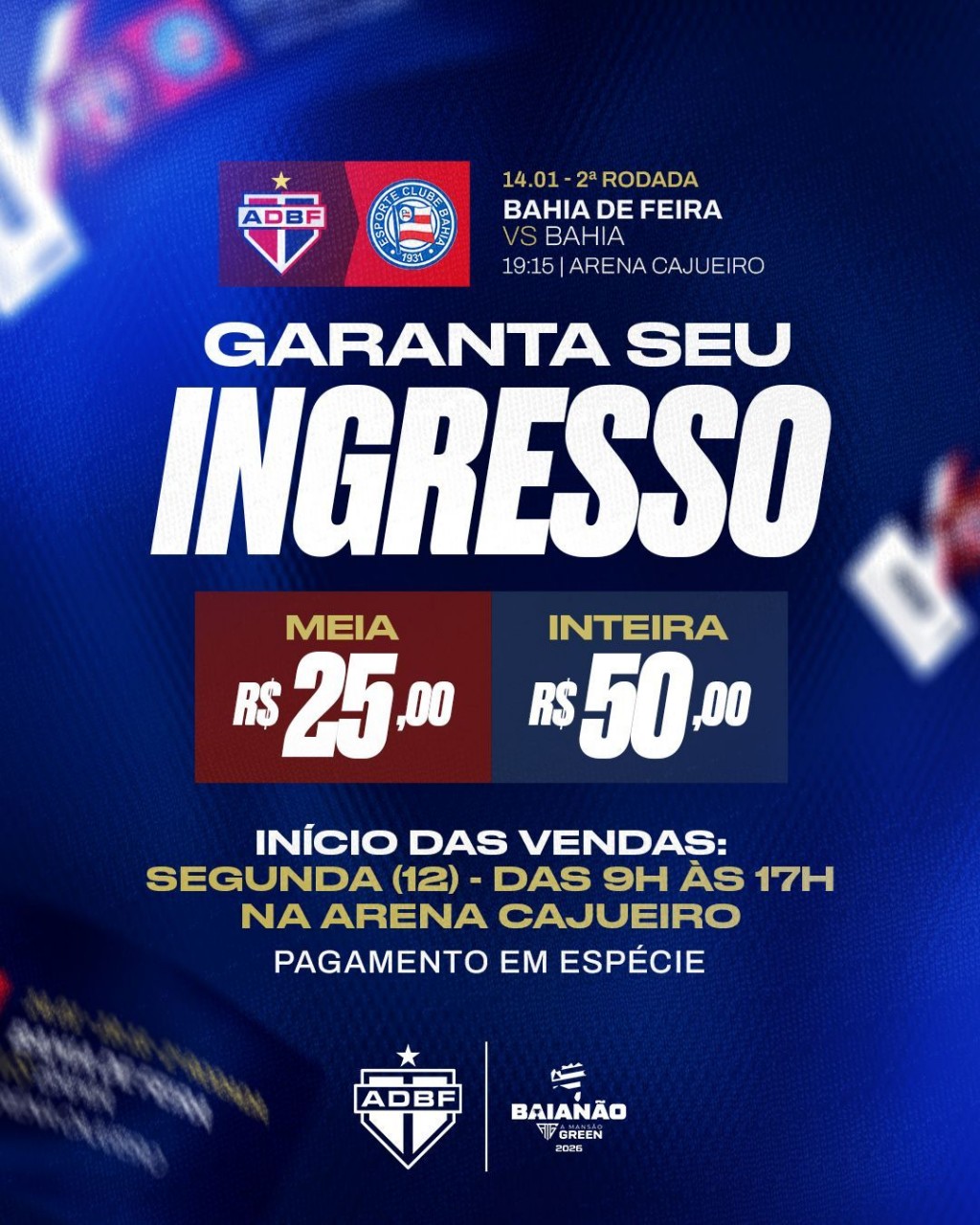 Feira de Santana Notícias 24h - A diretoria do Bahia de Feira anunciou na manhã deste sábado (10), que na próxima segunda-feira (12), dará início a comercialização dos ingressos para o confronto diante do Bahia, válido pela segunda rodada do Campeonato Baiano de 2026. A partida está marcada para a quarta-feira (14), às 19h15, na Arena Cajueiro, em Feira de Santana, e promete movimentar a cidade pelo peso histórico do duelo entre interior e capital.