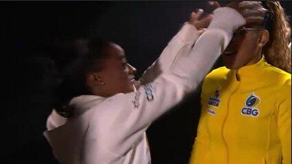 Simone Biles, ouro neste domingo, 8, fez gesto de passar a coroa para Rebeca Andrade