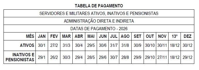 Os vencimentos de inativos e pensionistas serão pagos no penúltimo dia útil de cada mês, enquanto os salários dos servidores ativos serão depositados no último dia útil do mês trabalhado. A primeira parcela do 13º salário será quitada ao longo do ano, junto com as férias, se esta for a opção do servidor, ou no mês do aniversário. Já a segunda parcela será paga no dia 18 de dezembro.
