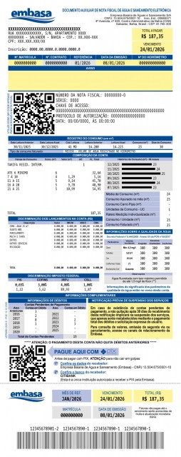 Em janeiro, a Embasa começou a emitir as faturas de água e/ou esgoto com novos elementos visuais. Agora, o documento passa a ser também um DANFe – Documento Auxiliar de Nota Fiscal de Água e Saneamento Eletrônica. Com isso, o cliente pode conferir na parte superior um QR Code que direciona para nota fiscal do serviço prestado pela empresa, além de outras informações da nota como site para consulta e chave de acesso.