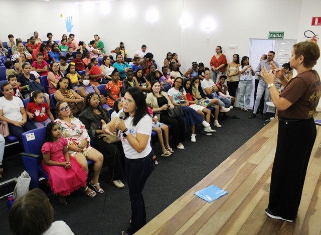 O auditório do equipamento municipal, mantido pela Secretaria de Educação, foi palco de uma roda de conversa que reuniu pais, professores e intérpretes de Libras. O encontro contou com a participação da psicóloga Shirley Marques, da professora e mãe de surdo Adriana Luz, e da intérprete de Libras e coda (filha de pais surdos) Júlia Cruz.