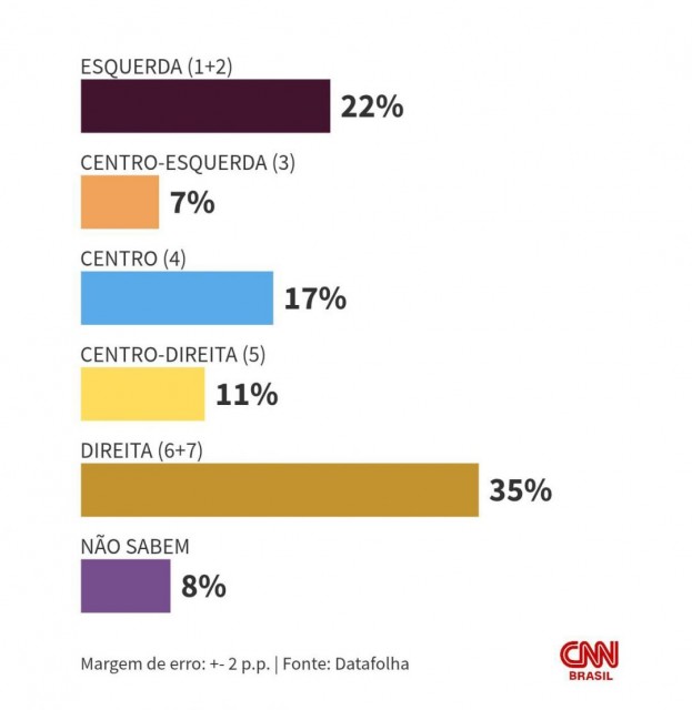 Para medir o espectro político, os entrevistados se posicionaram em uma escala de 1 (extrema esquerda) a 7 (extrema direita). O resultado mostra que 35% dos brasileiros se dizem de direita, 22% de esquerda, 17% de centro, 11% de centro-direita e 7% de centro-esquerda; 8% não souberam responder.