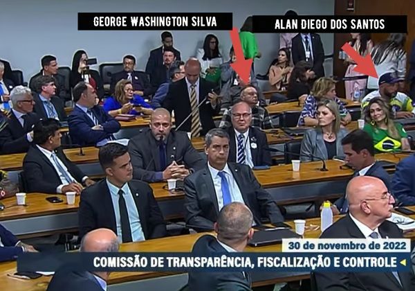 O portal O Antagonista flagrou o momento em que dois dos três suspeitos de preparar um ataque a bomba em Brasília, George Washington de Oliveira Sousa e Alan Diego dos Santos, compareceram em uma audiência da Comissão de Transparência, Fiscalização e Controle, no Senado, realizada no último dia 30 de novembro.