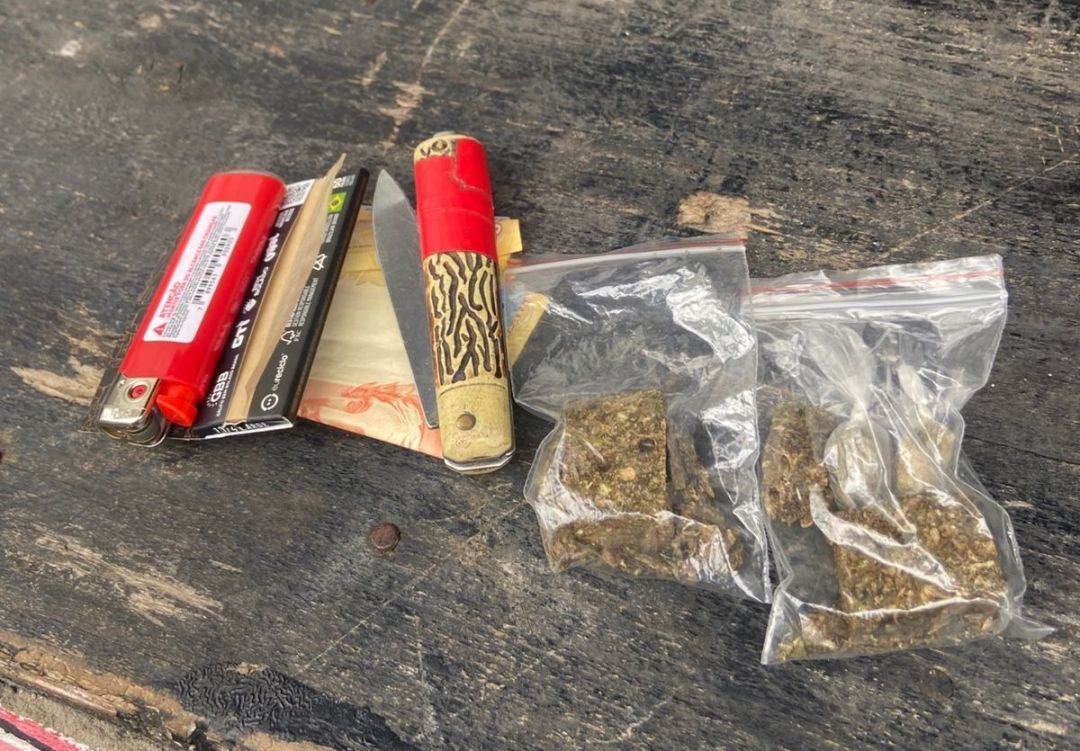 Já na tarde de quarta (19), outra guarnição que realizava rondas a pé avistou dois indivíduos em atitude suspeita. Ao perceberem a aproximação dos policiais, os homens dispensaram uma sacola, onde foram encontrados pinos de substância análoga à maconha, R$42,00 em espécie e um canivete. Ambos foram conduzidos à Central de Flagrantes, onde foi formalizado o registro da ocorrência.
