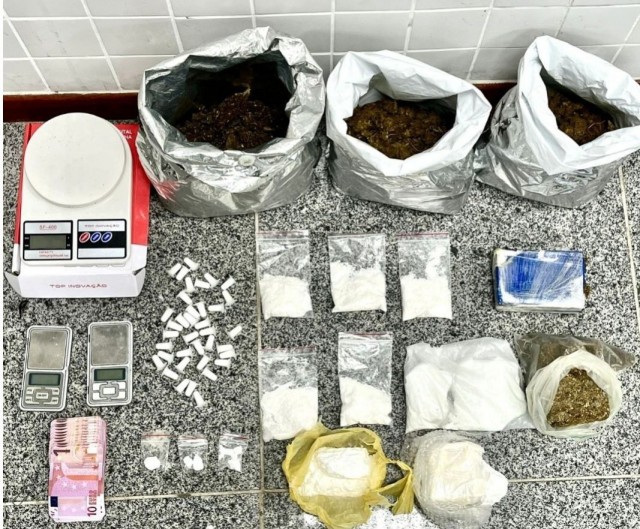 No local, foram encontrados três sacos grandes e duas porções de maconha, 37 pinos de cocaína, oito porções grandes e três pequenas da droga, além de três balanças de precisão e embalagens utilizadas para acondicionamento de entorpecentes.